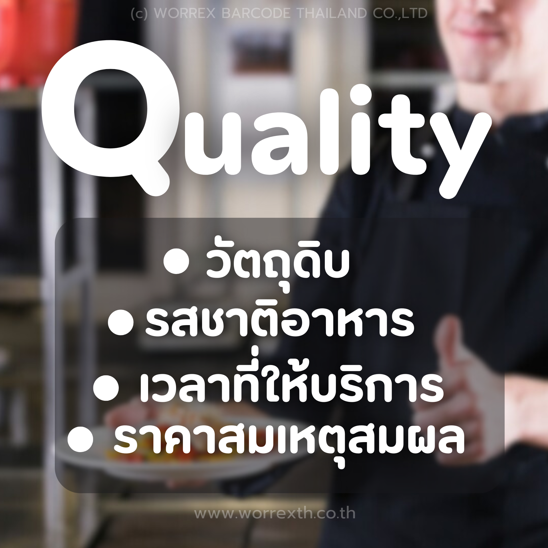 ซึ่งคุณภาพในที่นี้ไม่ได้หมายถึงแค่เรื่องรสชาติความอร่อยของอาหารเท่านั้น แต่ยังรวมถึงส่วนประกอบของอาหาร, วัตถุดิบที่ใช้ ความรวดเร็วในการเสริฟอาหาร รวมถึงการตั้งราคาที่ไปในทิศทางเดียวกันกับคุณภาพ (ไม่แพงจนลูกค้าเอื้อมไม่ถึง หรือถูกจนร้านขาดทุนยับ)