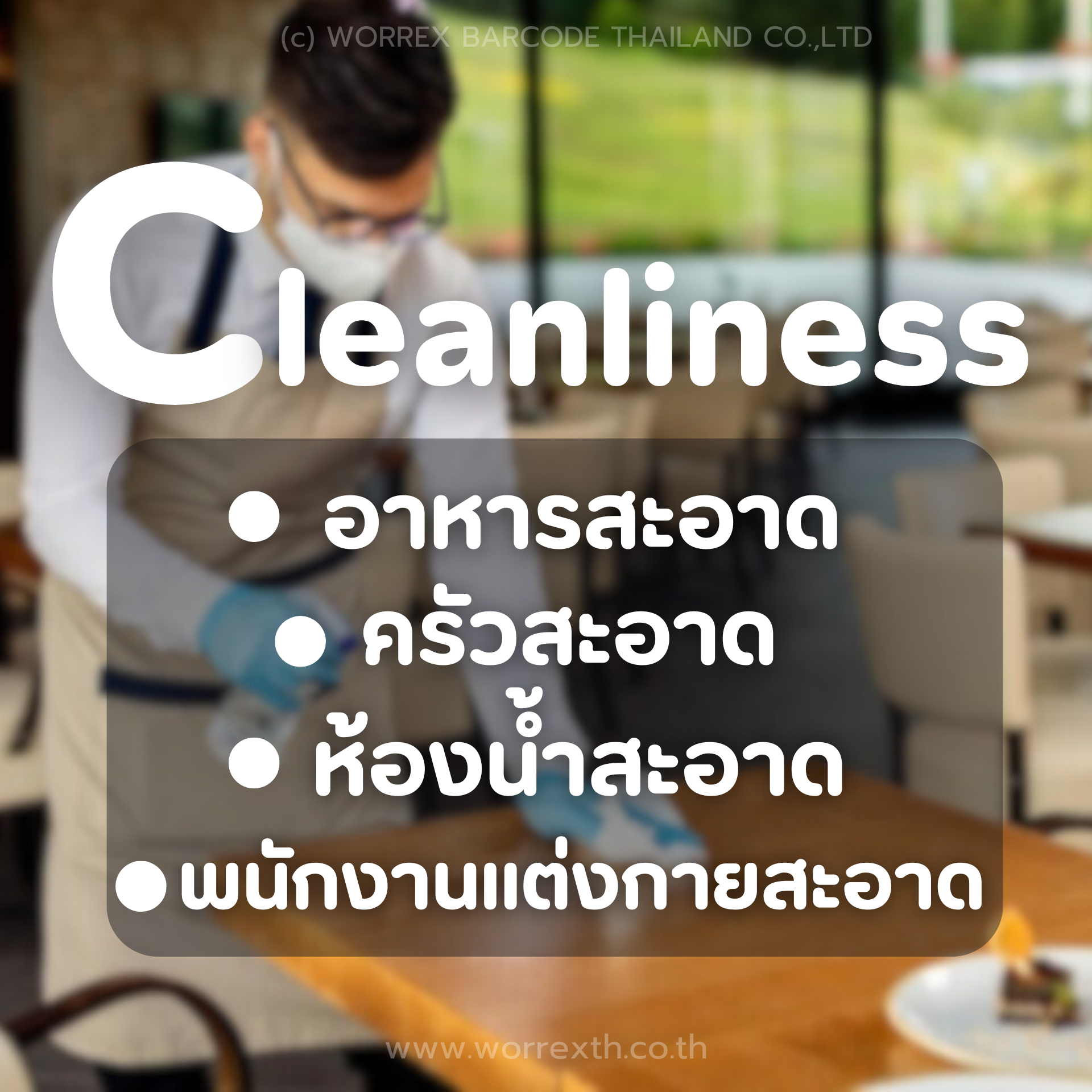 ด้านความสะอาด (Cleanliness) รายการความสะอาด หน้าร้าน, หลังร้าน, ครัว, ห้องสุขา และความสะอาดของพนักงานทุกคนในร้านอาหารด้วย
